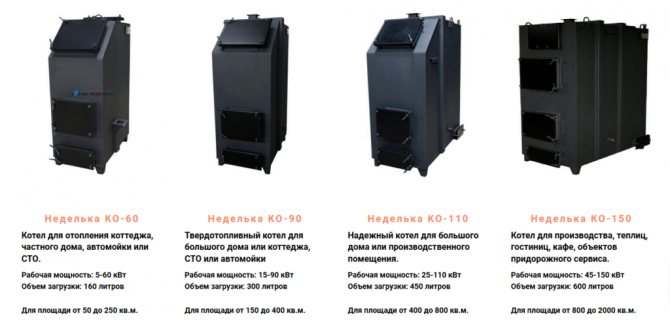 La société Nedelka propose quatre variantes de chaudières de différentes capacités, en supposant le chauffage de locaux de différentes tailles : 50-250 m², 150-400 m², 400-800 m², 800-2000 m² .