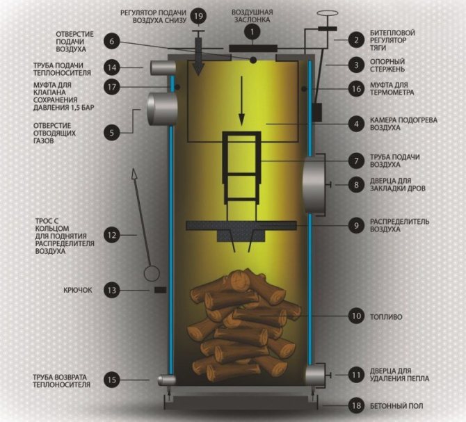 La chambre de la chaudière est divisée en deux parties par un distributeur d'air. Il a la forme d'un tuyau, auquel un tampon avec des lames est attaché à une extrémité, et l'autre extrémité sert à fournir de l'oxygène.