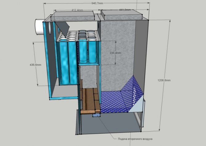La partie intérieure sert de foyer. Il est conçu pour que la combustion se produise de haut en bas. Ceci est facilité par une alimentation en air spéciale directement dans la zone de combustion. Le processus rappelle davantage la combustion lente avec la production de gaz à partir de combustibles carbonés. Dans une large mesure, ces gaz sont inflammables. En raison de leur postcombustion dans la partie supérieure du four, l'utilisation maximale d'énergie thermique se produit, ce qui permet d'augmenter le transfert de chaleur et de réduire la consommation de combustible.
