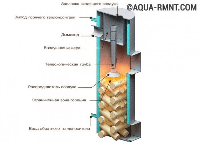 Structurellement, il se compose d'une grande chambre de combustion qui occupe environ 90% du volume total de la chaudière. L'air est fourni par le tuyau supérieur, qui est abaissé par gravité lorsque le carburant brûle. En fait, un processus de combustion lente a lieu, grâce auquel la température du liquide de refroidissement ne dépasse pas + 70 ° C.