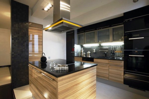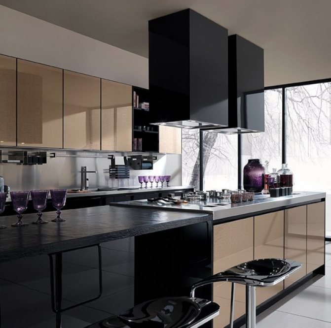 Les hottes îlots modernes (par exemple, sur la photo ci-dessous) ont une grande variété de formes et de tailles.Par conséquent, dans le contexte de la conception générale de la cuisine, elles ne seront pas perçues comme un élément inutile.