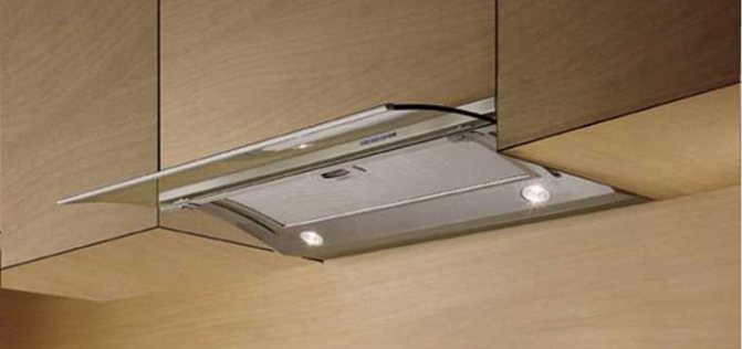 - Hotte intégrée.Installé dans un meuble de cuisine au-dessus de la plaque de cuisson, ce qui rend la hotte pratiquement invisible de l'extérieur. L'intérieur de l'armoire est relié à la ventilation. Le faible niveau de bruit et l'aspect esthétique font de ce modèle le plus populaire parmi les acheteurs. La hotte extractible augmente la surface à couvrir et se rétracte après la fin de la cuisson.
