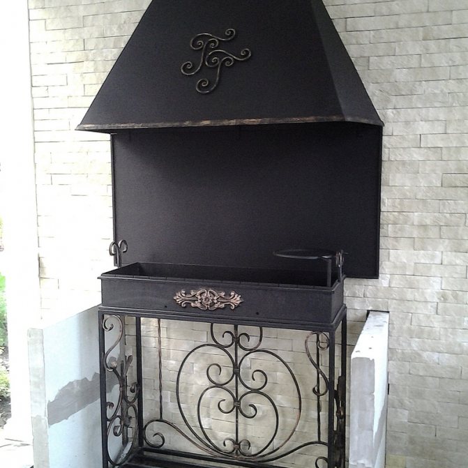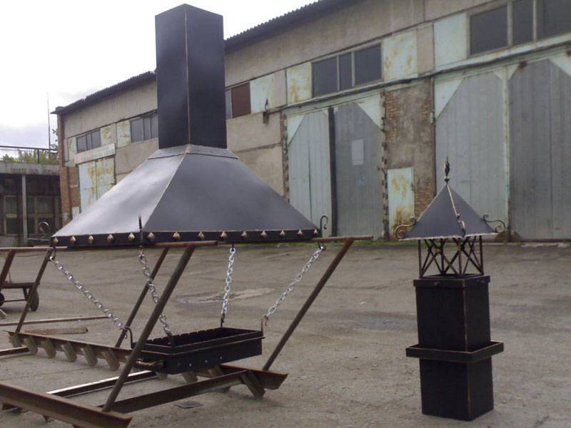 La fabrication d'un barbecue en métal est associée au soudage et à l'acier flexible, mais en général cela ne représente rien de compliqué, un artisan à domicile peut très bien le faire. Vous pouvez compléter les hottes avec un ventilateur afin que le tirage apparaisse immédiatement après l'allumage du bois de chauffage ou du charbon, sans attendre que la fumée se réchauffe et commence à pénétrer dans la cheminée de manière naturelle.