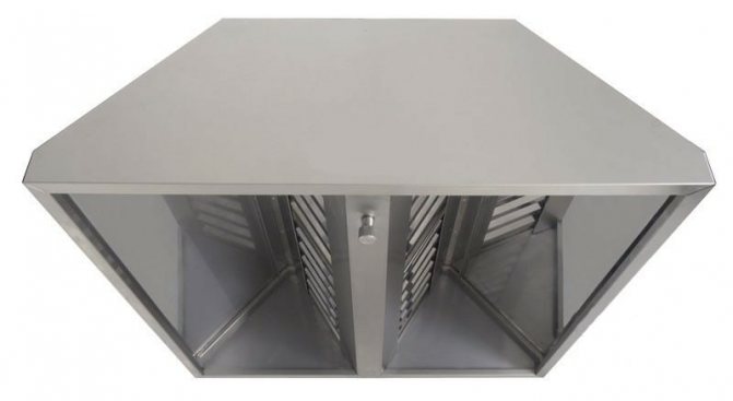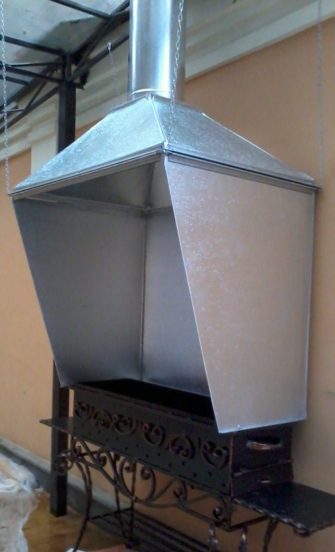 La structure métallique est une hotte aspirante dont le principe de fonctionnement est extrêmement simple. Il recueille les produits de combustion et les évacue par un tuyau de la pièce. Un tel parapluie doit être très lisse, car toute rugosité réduira son efficacité. Si vous préférez un parapluie en métal, vous devez également prévoir une large ouverture.