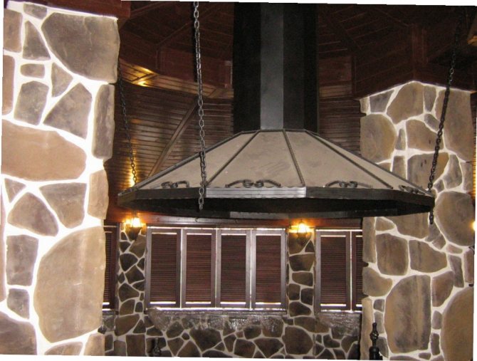 Beaucoup s'intéressent à la façon dont une telle hotte est fixée. Cela peut être fait soit avec des racks, soit avec des suspensions. Les premiers sont en brique ou en fer. Vous pouvez également ajouter un élément en fer intéressant - des chaînes massives sur lesquelles le capot sera monté.