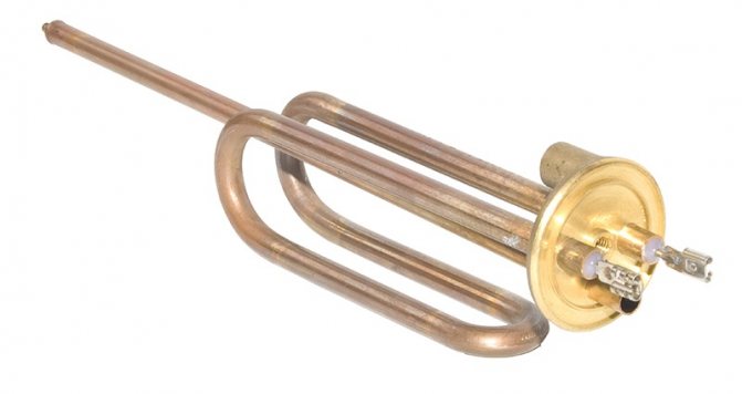 TEN - élément chauffant en cuivre (moins souvent en acier inoxydable) et spirales nichromes. L'électricité à travers la tige métallique de l'élément chauffant (métal à haute résistance) passe en spirale vers la coque tubulaire et le milieu chauffé. Les éléments chauffants sont résistants à la formation de tartre, se distinguent par des performances et une fiabilité élevées. La durée de l'élément chauffant, avec un bon fonctionnement, est de plus de 3 ans.