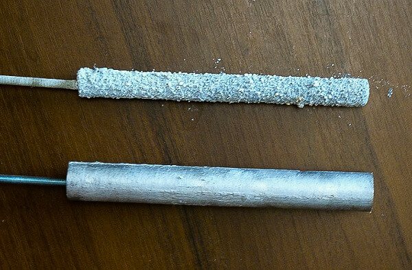 Si vous prenez une anode inutilisée, qui est une partie interne de la chaudière, elle ressemble à une barre grise avec une surface légèrement rugueuse. Après un certain temps de fonctionnement du chauffe-eau, des traces d'actions corrosives apparaissent sur la tige, mais le réservoir restera intact. Si, lors d'un contrôle de routine du réservoir, vous avez remarqué que plus de 50% de l'anode est recouverte de cratères profonds et qu'elle s'effrite elle-même, assurez-vous de la remplacer par une neuve, mais avec toutes les caractéristiques du même être préservé.