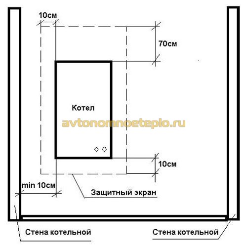 Selon la joint-venture, le mur de la chaufferie sous la chaudière peut être gainé d'une plaque d'amiante recouverte d'acier inoxydable ou galvanisé. L'écran de protection doit dépasser de 10 cm autour du périmètre de la chaudière. Le revêtement d'un mur de briques ou de béton, de carreaux de céramique ou de plâtre est autorisé.