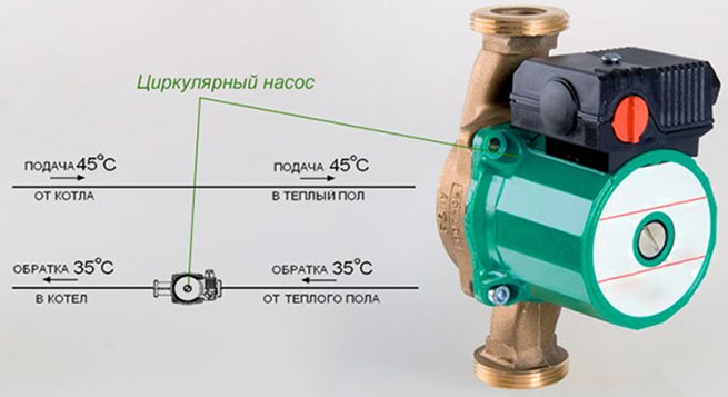 Si la pression n'est pas assez bonne et qu'un mélangeur n'est pas nécessaire, une pompe de circulation est utilisée. Il est monté sur la conduite de retour, car lors de la disposition à l'alimentation, il prélèvera de l'eau supplémentaire du système de chauffage et moins de chaleur restera dans les radiateurs.