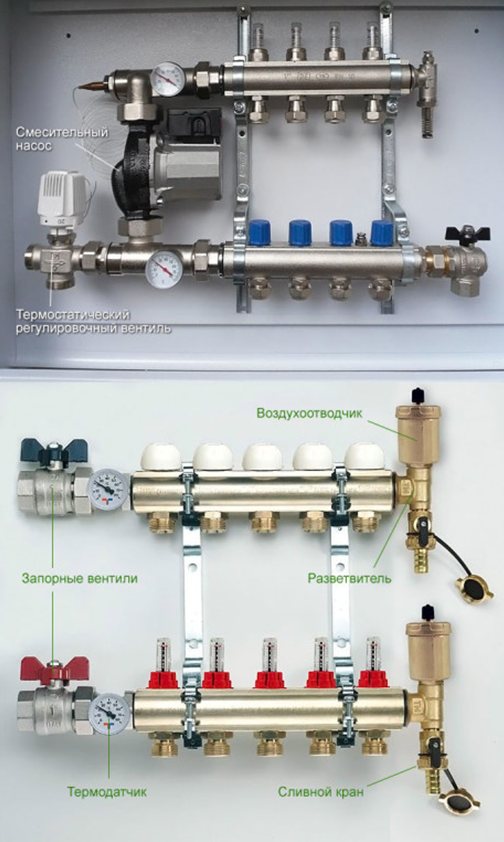 La conception la plus simple consiste en des collecteurs conventionnels avec des vannes d'arrêt. Le retour et l'alimentation sont connectés à des tuyaux et des robinets, des tuyaux de support et des collecteurs sont également connectés. Ce schéma est facile et rapide à installer, mais c'est le moins pratique.