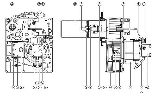 A - papillon des gaz pour la régulation de l'air; D - bloc du système d'allumage avec capteur de contrôle de flamme; E - conduite de carburant; F - moteur de ventilateur; G - pompe; K, N - conduites d'alimentation et de retour de carburant; І - électrovanne; L - bouton pour réinitialiser le signal de dysfonctionnement; M - contrôle automatique du chauffage; N - console; О - câble d'allumage; Р - électrodes du système d'allumage; R - pièce de travail cylindrique; S - dispositif de mélange; T - buse; U - tige avec réchauffeur de carburant; V - dispositif d'admission d'air; W - corps de brûleur; X - canal d'air; Y - roue du ventilateur.