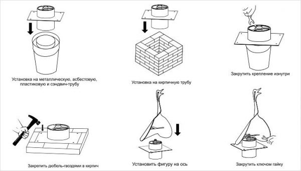 Sur les cheminées en brique, même des clous galvanisés standard de longueur suffisante, implantés directement dans la maçonnerie, peuvent être utilisés pour fixer le «parapluie». Cependant, comme le montre la pratique, il est préférable de percer des trous dans la maçonnerie à travers les trous pré-percés dans les poteaux de parapluiepuis fixez la hotte sur la cheminée avec des goupilles en acier ou des vis galvanisées.