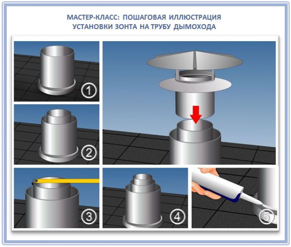 Le parapluie n'empêche pas l'évacuation de la fumée avec les produits de combustion uniquement avec le bon choix d'un tel appareil... Par exemple, dans les zones à fortes chutes de neige, il est conseillé d'utiliser des éléments supplémentaires avec un grand angle d'inclinaison pour la fonte sans entrave de la masse de neige.