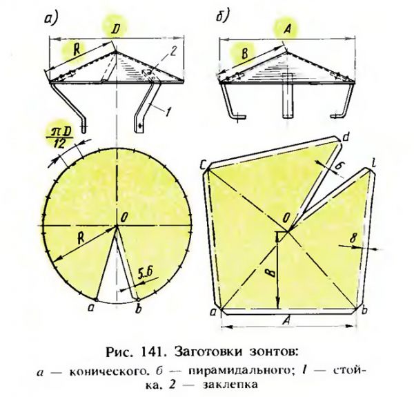 Parapluie de taille 500 x 500, prenez le côté 500, ajoutez encore 100 mm, cela est nécessaire pour que le haut du parapluie recouvre la jupe du bas. Divisez les 600 mm résultants en deux, il en résulte 300 mm. Voir la photo dans l'image MAIS)