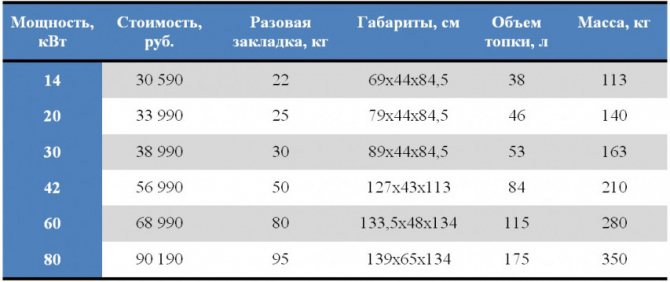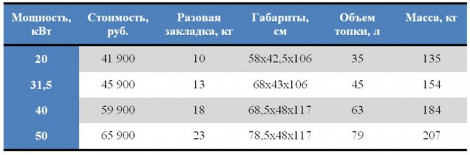 2.2. Stakhanov. Il s'agit d'une ligne de cinq chaudières d'une capacité de 15 à 100 kW, conçues pour la combustion du charbon. Une trémie est destinée à leur chargement (il existe des modèles avec une disposition à droite ou à gauche). Le charbon est introduit automatiquement dans la chambre de combustion au moyen d'un assemblage à deux vis. Il est également possible de travailler le bois, qui est chargé manuellement. Stakhanov Zota est équipé d'une commande automatique. Le coût de la chaudière dépend de la disponibilité d'options supplémentaires: un module de commande à distance ou un élément chauffant (3-16,7 kW).