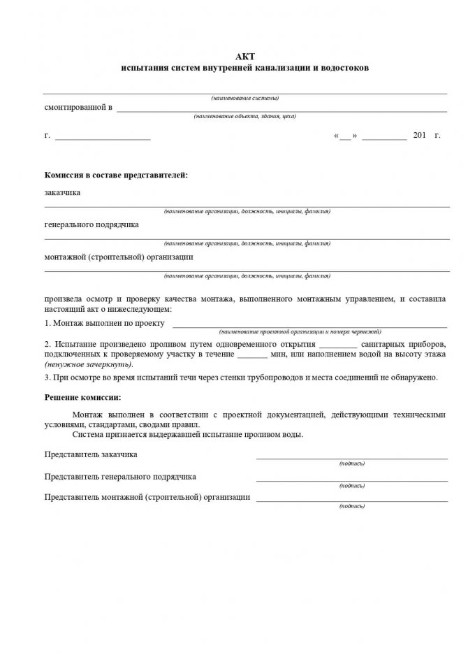 Le rapport d'essai pour l'assainissement interne et externe est établi à la suite du contrôle des performances du système. Il fixe la position de la commission selon laquelle le système a réussi le test de déversement d'eau et la conception est conforme à la documentation de conception, aux GOST et aux normes.