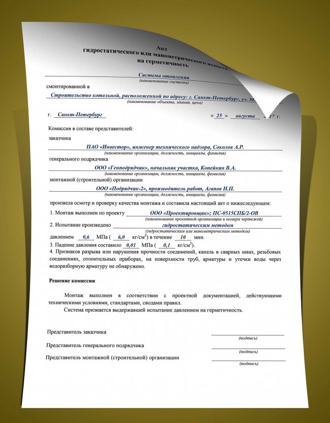 - Dans la section «Décision de la Commission», chacun de ses membres met une signature avec un décodage, si le pipeline a passé le diagnostic pneumatique, et est hermétiquement scellé et durable.