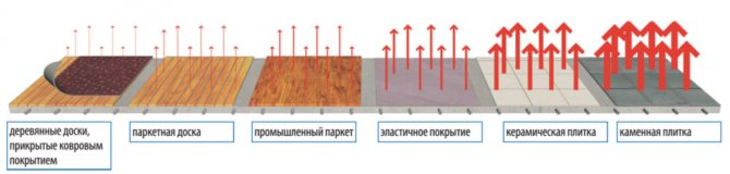 Si l'on compare tous les revêtements entre eux, alors à la même température dans toutes les pièces, le flux de chaleur ascendant sera plus faible pour les parquets et moquettes, ce qui s'explique par la mauvaise conductivité thermique de ces supports. Le linoléum et les carreaux de céramique ont le flux le plus élevé et une bonne conductivité thermique.