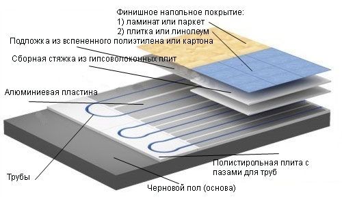Ce type de revêtement est constitué de matériaux polymères. Dans ce cas, aucune isolation n'est installée au-dessus des tuyaux du plancher chaud, mais uniquement le mélange ciment-béton et l'enduit principal, dans un rapport de 4 à 0,2 cm.