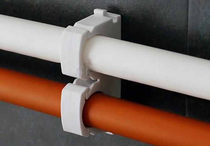 Les fixations sont placées par incréments de 0,7 à 1 m, pour le chauffage et l'alimentation en eau chaude - 0,5 à 0,7 m Les magasins sont remplis de toutes sortes de clips et de pinces de tous diamètres. Des brackets faits maison peuvent également être utilisés. Les fixations sont fixées aux murs en béton avec des chevilles de 6 × 40 mm, au béton plâtré, à gaz ou en mousse - 6 × 60 mm ou même plus.