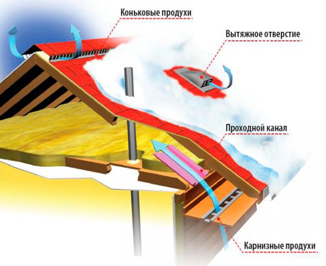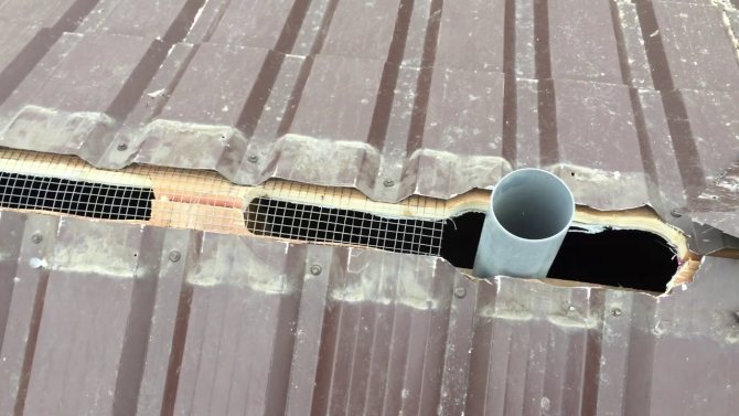 Avec une forme de hanche, des espaces doivent être prévus sur l'avant-toit de l'avant-toit, à travers lesquels l'air entrera librement dans le grenier. Pour son retrait, des trous doivent être faits au niveau de la crête.