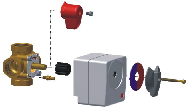 Un actionneur électrique est une pièce qui combine les trois types de vannes à trois voies. À l'aide d'un entraînement intégré avec un contrôleur, une régulation automatique de la température de l'eau est effectuée en raison de la réponse de l'appareil aux changements de température de l'eau. Un entraînement électrique, également appelé servomoteur, est un moteur, mais il ne tourne pas autour de son axe, comme les appareils conventionnels, mais effectue un tour dans un rayon limité.