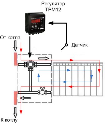 Une vanne mélangeuse à trois voies combine deux flux d'eau en un seul et régule également la température du caloporteur, mais selon un principe différent. La vanne est raccordée aux dérivations d'entrée et de sortie du système fermé. L'un reçoit de l'eau chauffée de la chaudière, le second reçoit le liquide de refroidissement déjà refroidi, qui a fait un cercle à travers le système. En mélangeant deux flux en un, la vanne régule la température de l'eau dans la limite définie. Une fois les valeurs souhaitées atteintes, le liquide entre dans le deuxième circuit (par exemple, un sol chaud).