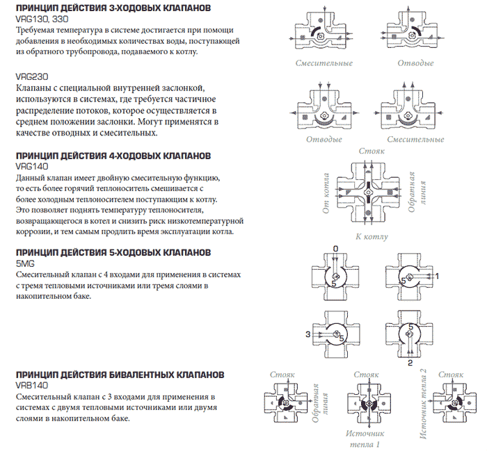 La vanne mélangeuse peut être utilisée comme composant du système de chauffage « plancher chaud », qui maintient automatiquement une température stable du caloporteur dans le conducteur, l'empêchant de surchauffer. La conception de la vanne mélangeuse comprend un corps en fonte ou en laiton (nickelé sur certains modèles) où se trouve le dispositif de mélange et de séparation. Un type de vanne pour les chaufferies - une vanne mélangeuse à trois voies a une paire de trous (sortie et entrée), et il existe également des vannes à quatre et cinq voies (ayant respectivement quatre et cinq trous).