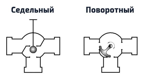 Lorsqu'une certaine température doit être atteinte, la tige monte, ouvrant le conduit. Ceci est similaire au principe de fonctionnement des vannes d'arrêt. Et le mécanisme lui-même s'appelle une selle. Au lieu d'une tige, une bille ou un secteur tournant est parfois utilisé. Exactement comme dans les robinets à tournant sphérique conventionnels. Ce mécanisme est appelé rotatif. Sur le schéma, ils peuvent être représentés comme suit :