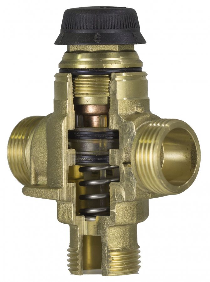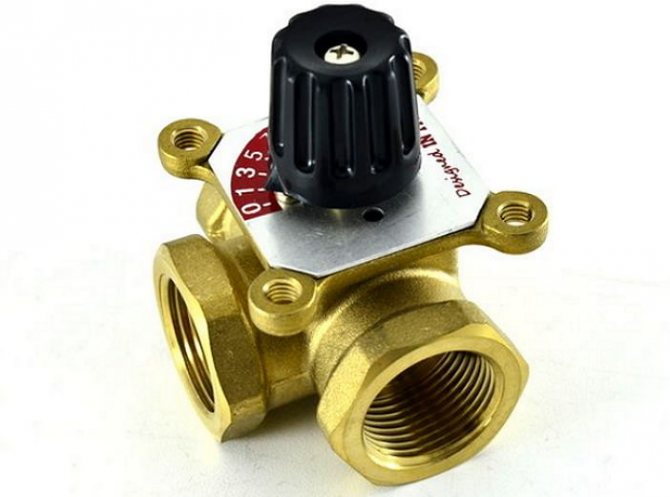 Comme son nom l'indique, cette valve a 3 temps. Vous pouvez même l'appeler une grue, car elle appartient aux vannes d'arrêt et de contrôle. Il ressemble à un tee ordinaire, mais à l'intérieur sa structure est beaucoup plus compliquée. En gros, il sert à changer la température de l'eau. Il y a deux manières : dans la première, le retour est mélangé avec l'alimentation pour abaisser la température ; la seconde méthode, au contraire, divise les cours d'eau en déversant de l'eau chaude dans la conduite de retour. Ceci est utile dans divers cas:
