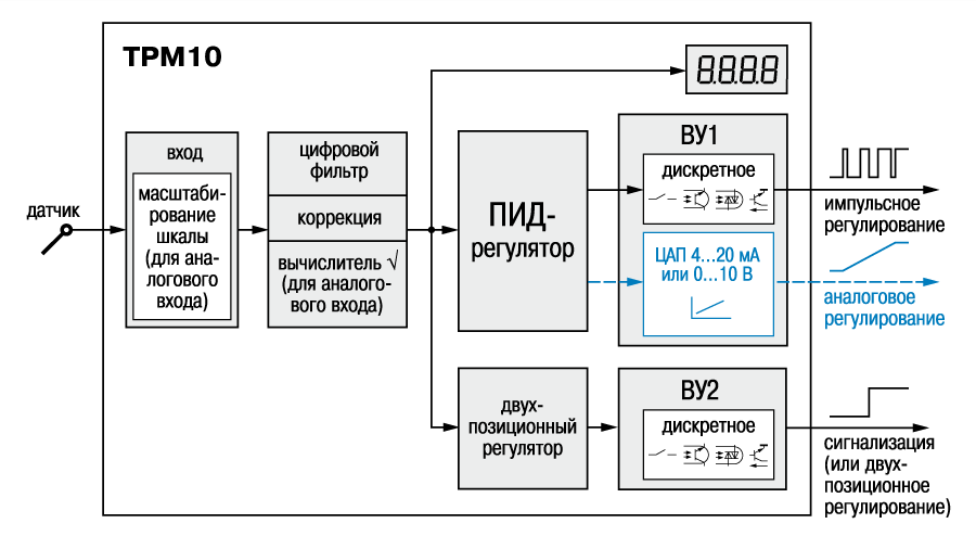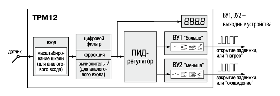 Le TPM12 n'est pas adapté à la commande d'un actionneur de vanne avec un signal d'entrée analogique. Au lieu de cela, vous pouvez choisir, par exemple, TPM10. Voici son schéma fonctionnel: