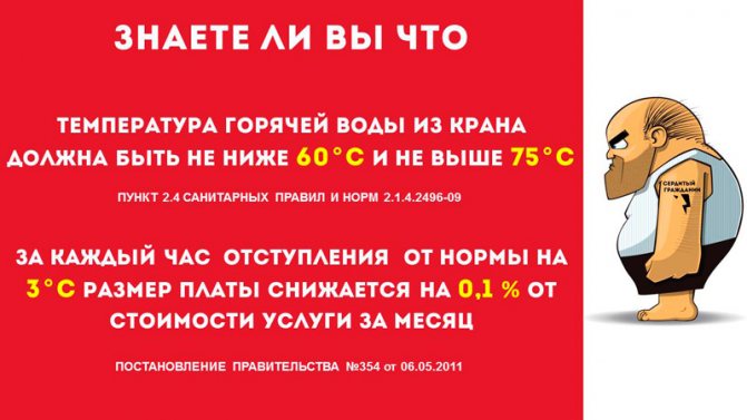 En bref - principalement 60 - 75 degrés Celsius avant le 1er septembre 2012, et dans tous les cas, sans exception, 60 - 75 degrés Celsius après le 1er septembre 2012. Avec l'installation de compteurs d'eau, ce problème devient presque d'une importance primordiale, car en réduisant la température de l'eau chaude fournie aux appartements, l'entrepreneur économise non seulement sur le chauffage, mais augmente également la consommation des consommateurs dans le robinet d'eau chaude. , dont le tarif est plus élevé par rapport à l'eau froide. Parfois, vous pouvez trouver une option de réponse: "au moins 50 degrés Celsius", en référence au paragraphe 5, section II, annexe n ° 1 aux règles pour la fourniture de services publics aux citoyens, approuvées par décret du gouvernement de la Russie Fédération n°307 du 23 mai 2006. C'est une réponse erronée pour la grande majorité des cas.