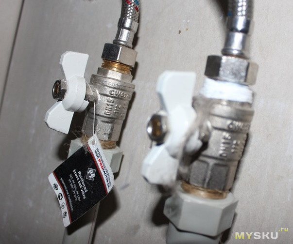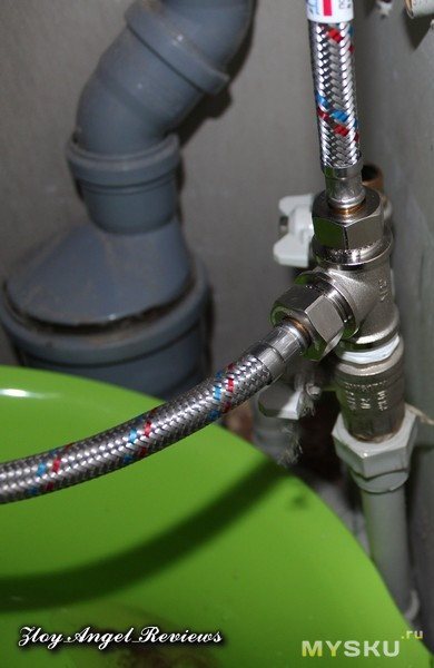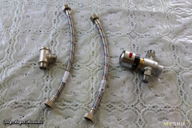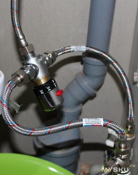 Nous enroulons le tuyau sur l'entrée d'eau chaude. Nous le vissons aux entrées du thermostat, respectivement, avec l'indication sur son corps.