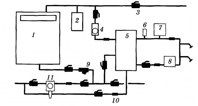 1 - chaudière; 2 - vase d'expansion; 3 - vanne à bille; 4 - pompe de circulation; 5 - chaudière; 6 - soupape de sécurité; 7 - vase d'expansion pour l'alimentation en eau chaude; 8 - pompe de recirculation ; 9 - filtre; 10 - clapet anti-retour; 11 - dispositif de remplissage automatique du système
