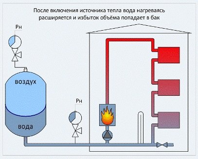 Étant donné que dans la conception de systèmes de chauffage autonomes, afin d'économiser, une marge de sécurité est prévue dans un petit, même un saut de basse pression jusqu'à 3 atm peut provoquer une dépressurisation des éléments individuels ou de leurs connexions. Afin de lisser les chutes de pression dues à un fonctionnement instable de la pompe ou à des changements de température du liquide de refroidissement, un vase d'expansion est installé dans un système de chauffage fermé. Contrairement à un appareil similaire dans un système de type ouvert, il n'a aucune communication avec l'atmosphère. Une ou plusieurs de ses parois sont constituées d'un matériau élastique, grâce auquel le réservoir agit comme un amortisseur en cas de coups de bélier ou de chocs d'eau.