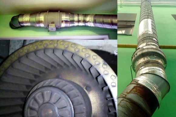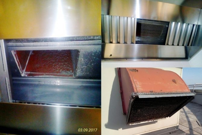 Cliquez pour agrandir | Cependant, malgré les filtres, au fil du temps une couche de graisse se dépose sur les parois du parapluie, les conduits d'air, les pales du ventilateur. Si la fréquence de nettoyage est insuffisante, la graisse s'épaissit, durcit et se transforme finalement en un état comprimé. Le nettoyage de la graisse comprimée est très difficile, il est parfois nécessaire de remplacer complètement les éléments du système de ventilation. |