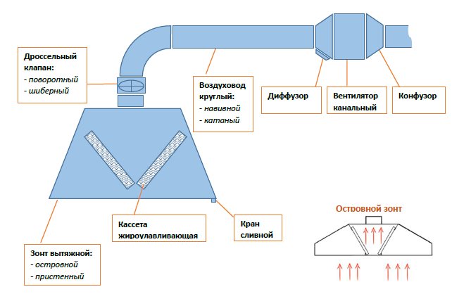 Cliquez pour agrandir | Le système de ventilation d'extraction de graisse a le plus besoin d'être nettoyé. Les hottes de cuisinière et de gril aspirent les vapeurs et les odeurs de la zone de cuisson. Ensuite, il y a une purification primaire de l'air à partir des particules de graisse, pour cela il y a des cassettes de graisse. |