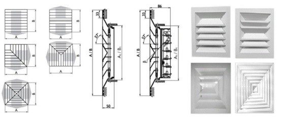 Ils ont des lames intégrées qui guident le flux d'air. Ils peuvent avoir des motifs carrés et ronds dans des styles gothiques classiques, modernes et ajourés, et peuvent être intégrés dans tout type de plafond. Utilisé pour l'air soufflé et extrait. Les concepteurs peuvent les utiliser comme élément de conception.