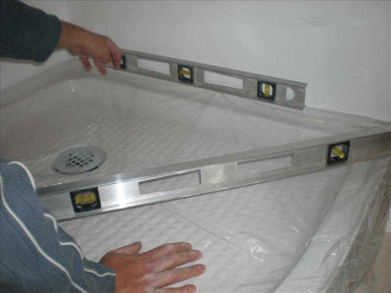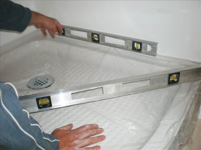 Il est nécessaire de régler la palette de vos propres mains strictement en fonction du niveau. Étant donné que seule une installation parfaite fournira un drain fiable et que l'eau ne s'accumulera pas dans les coins de la palette.