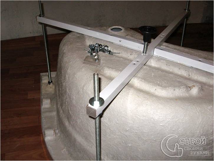 Il y a des moments où le montage du cadre repose sur les deux pieds extérieurs. Ensuite, des supports supplémentaires doivent être fabriqués indépendamment. Ils peuvent être fabriqués de vos propres mains à partir d'un tuyau en acier rectangulaire ou d'une brique. Pour l'installation directe de l'auge de ce produit de plomberie, une telle fondation doit être recouverte sur le dessus d'un joint en caoutchouc épais pour assurer un contact doux entre l'acrylique et la brique.