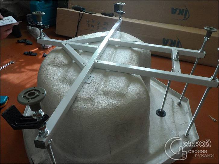 Toutes les palettes pour l'installation sont équipées de pieds réglables. Une attention particulière doit être accordée au renforcement des fondations d'un tel produit. La plupart des structures de douche en acrylique ont un point faible au centre, car il y a très peu de support externe. Par conséquent, si elle est mal disposée, cette pièce peut se fissurer et causer beaucoup de problèmes.