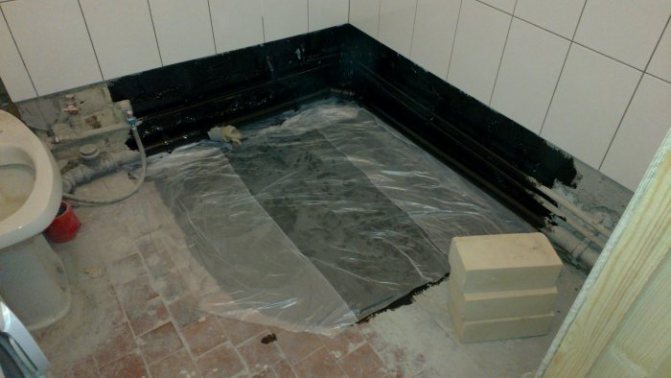 Les carreaux peuvent être démontés avec un perforateur ou recouverts de mastic bitumineux, ce qui évitera une éventuelle humidité du sol. Au-dessus du mastic se trouve une double couche de polyéthylène ou de matériau de toiture. Il est très important de mettre l'imperméabilisation sur les murs! Dans le processus de réalisation de cette étape, vous pouvez utiliser du caoutchouc fibre ou tout autre scellant familier.