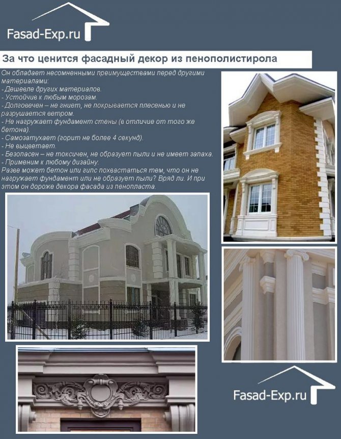En fait, ce sont des objets de décoration de haute qualité, légers et abordables. En raison de la flexibilité de la mousse, il est possible de créer des produits de tout degré de complexité. Ainsi, le décor de la façade en polystyrène est devenu très populaire, en particulier parmi ceux qui aiment la décoration de façade sophistiquée et complexe. Pourquoi ces produits sont-ils si bons?