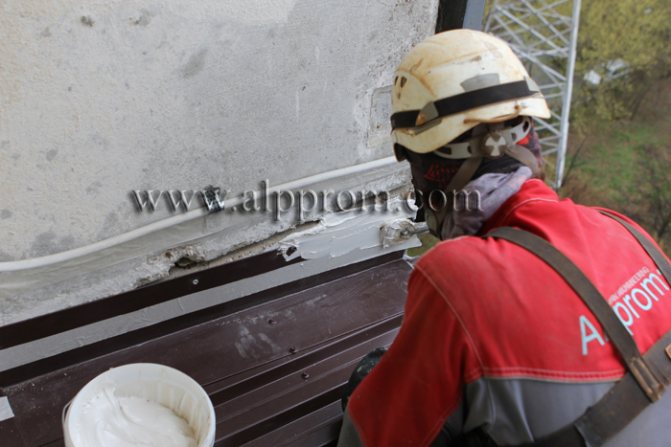 Si la visière est en béton, il est nécessaire d'utiliser un mastic polyuréthane ou un mastic polymère. Pour une étanchéité de haute qualité, il est nécessaire de traiter soigneusement toutes les fissures et les joints, en particulier en faisant attention à l'endroit entre le bâtiment et la visière.
