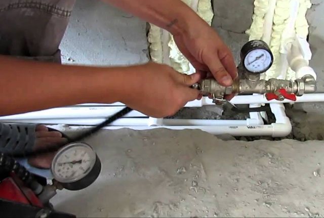 - Test de pression primaire - effectué immédiatement après l'achèvement des travaux d'installation. Le diagnostic est effectué avant que les tuyaux ne soient encastrés dans les rainures. Le système de chauffage par le sol doit également être accessible - il ne doit pas être coulé avant le sertissage. Il est à noter qu'il est permis de re-diagnostiquer tous les contours après avoir réalisé la chape et l'étanchéité. Dans ce cas, vous pouvez vous débarrasser du problème.
