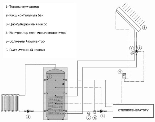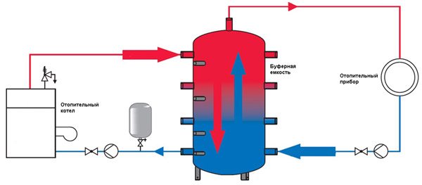 De plus, l'astuce ici est que le liquide de refroidissement du réservoir n'arrive pas de manière constante après la mise en marche, mais est fourni périodiquement - dès que le signal est déclenché que la température dans les radiateurs est devenue inférieure à un chiffre prédéterminé.Un tel système de chauffage avec accumulateur de chaleur vous permet d'utiliser le liquide de refroidissement le plus efficacement possible.