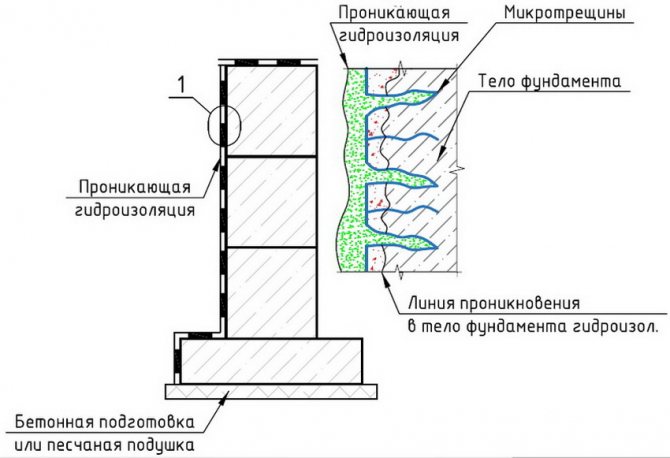 - Imperméabilisation pénétrante pertinent en ce qui concerne la pression des eaux souterraines et le manque de drainage. L'idée est d'utiliser la pression de l'eau, qui pousse le matériau de protection plus fort contre la surface de la maison. L'imperméabilisation pénétrante est conçue pour remplir les cavités qui apparaissent dans les murs et aider à empêcher l'humidité de pénétrer. Par exemple, le béton a une structure poreuse, s'il est imprégné d'une solution hydrophobe spéciale, il repoussera l'eau.