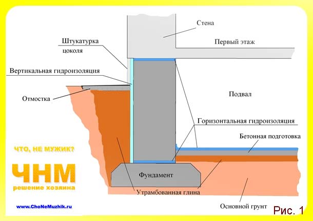 Lors de l'imperméabilisation du sol, une couche d'argile huileuse d'une épaisseur d'environ 0,2 mètre est d'abord posée. L'argile est tassée, compactée avec de la pierre concassée. À partir d'une teneur en béton résistant à l'humidité ne dépassant pas M100, au-dessus de l'argile, nous effectuons une préparation d'une épaisseur de 5 à 7 cm. des murs. Nous réalisons le dispositif du sol (Fig.1).