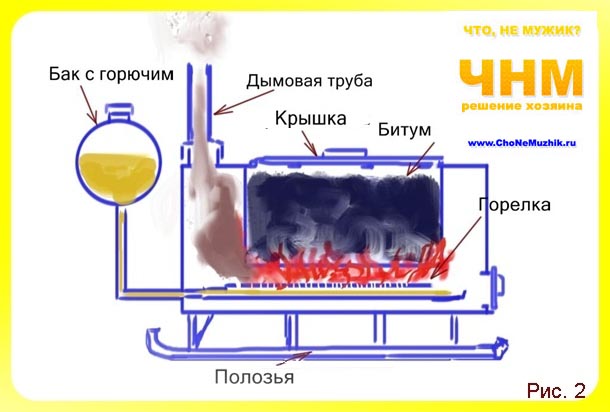 Vous ne pouvez faire que le bitume fondu, cependant, il durcit trop rapidement, surtout par temps froid. Par conséquent, nous ajouterons 20-30% d'un plastifiant au bitume - n'importe quelle huile bon marché, (même "fonctionnant" connu de tout automobiliste). Versez le bitume fondu dans l'huile sous agitation. Une petite quantité de bitume peut être fondue dans un tonneau en fer ou un grand seau, pour les gros volumes, vous aurez besoin d'un "bitume maker" (voir fig. 2 pour sa construction).