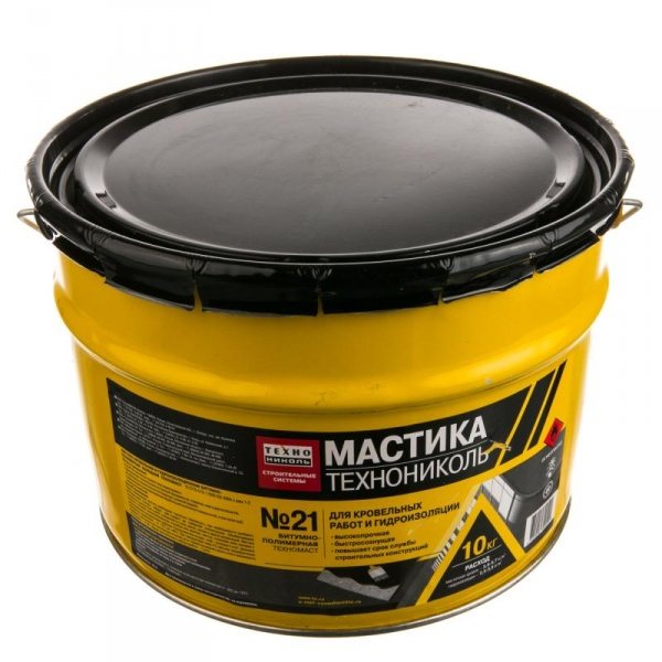 - Le mastic TechnoNIKOL n ° 21 (technomast) est un matériau à haute résistance et résistance à l'eau. Il est appliqué à froid, cependant, à des températures inférieures à zéro, il doit être chauffé. Il est appliqué en deux couches;